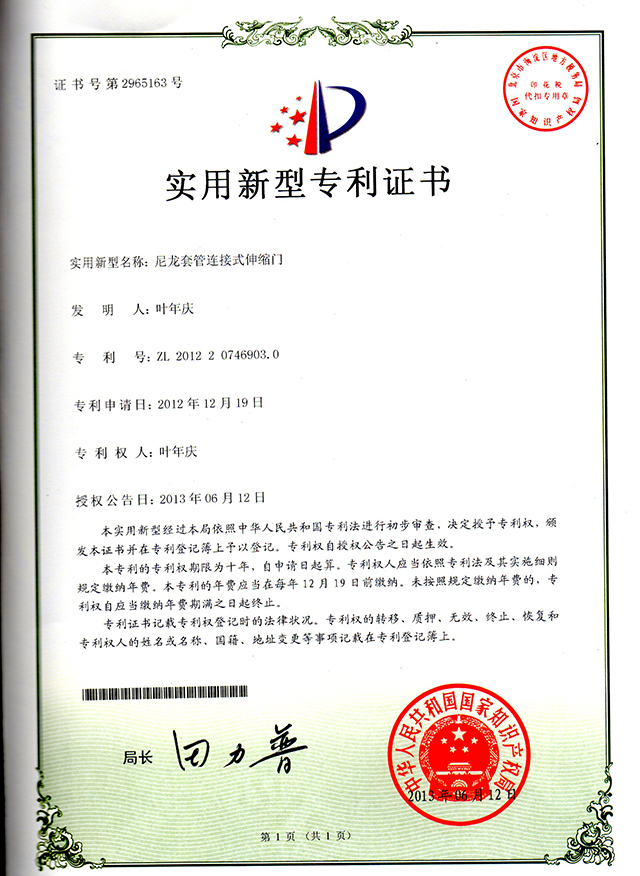 平移門發(fā)明專利證書