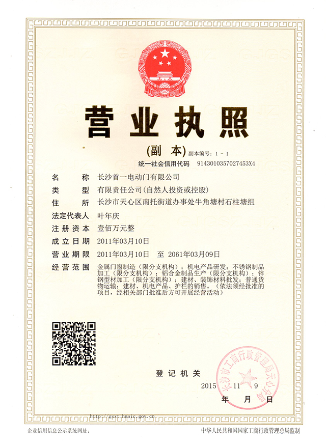 長沙首一電動門有限公司(營業(yè)執(zhí)照代碼:9143010357027453X4)